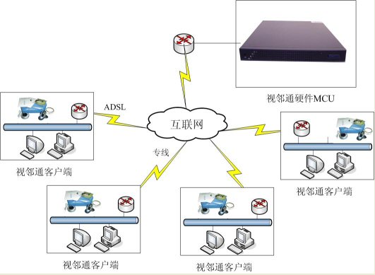 視鄰通系統(tǒng)采用軟硬結合的解決方案思想進行設計,主要組成是一個MCU,依據(jù)點數(shù)配備軟件終端,軟件終端含一個帶云臺可遠程遙控的攝像頭,以及一個自帶回音消除的全向麥與小音箱。和傳統(tǒng)323產(chǎn)品比較,部署簡單,靈活,在互聯(lián)網(wǎng)表現(xiàn)效果良好,并具備強大的數(shù)據(jù)功能,同時價格更具競爭力,而純軟視頻會議系統(tǒng)相比,則在穩(wěn)定性,清晰度上更勝一籌。