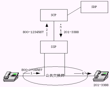 該圖示業(yè)務(wù)工作過程如下:(1)主叫用戶撥800號(hào)號(hào)碼,(2)SSP向SCP查詢800號(hào)號(hào)碼,(3)SCP查詢數(shù)據(jù)庫后向SSP送回譯碼結(jié)果(真正被叫號(hào)碼),(4)SSP連接主、被叫,振鈴。