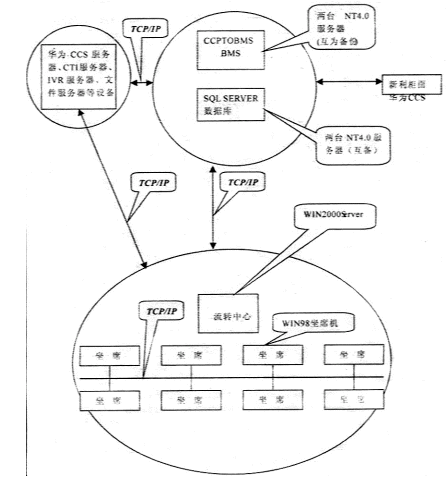 系統(tǒng)采用總部集中模式,前臺運(yùn)行信雅達(dá)通訊轉(zhuǎn)接程序(CCPTOBMS)和信雅達(dá)業(yè)務(wù)處理程序(BMS)。通訊轉(zhuǎn)接程序從華為接入平臺接收各類業(yè)務(wù)請求,再轉(zhuǎn)發(fā)至業(yè)務(wù)處理程序。業(yè)務(wù)處理程序與新利處理中心通訊,將各類業(yè)務(wù)請求分類處理。后臺數(shù)據(jù)庫選用兩臺服務(wù)器安裝SQLSERVER7.0,使用OCTOPUS進(jìn)行數(shù)據(jù)備份。