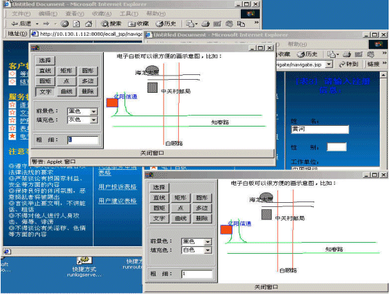 電子白板功能是在語(yǔ)音文字交談之外,ICWEB為用戶(hù)提供的圖形交談工具。電子白板允許多個(gè)在線(xiàn)用戶(hù)同時(shí)在界面里繪制刪除任意圖形,寫(xiě)字、插入圖片以及用標(biāo)志工具標(biāo)示某些區(qū)域。電子白板功能可以有效地補(bǔ)充文本交談功能所不具備的圖示功能。