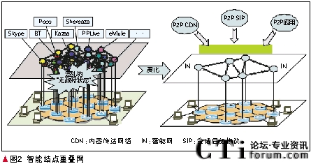 智能節(jié)點(diǎn)重疊網(wǎng)是覆蓋在IP核心網(wǎng)上的傳統(tǒng)的彈性重疊網(wǎng)(RON)技術(shù)與分布式哈希表(DHT)技術(shù)相結(jié)合的新型重疊網(wǎng)技術(shù),包括自動(dòng)組網(wǎng)、網(wǎng)絡(luò)資源管理、路由優(yōu)化等關(guān)鍵技術(shù)。其基本結(jié)構(gòu)是保持TCP/IP協(xié)議不變,原來的3層變成3-層,在其上建立一個(gè)智能結(jié)點(diǎn)重疊網(wǎng)做為3+層,在此分布式管理平臺(tái)上提供流量監(jiān)控、流量控制、QoS、病毒防止和安全性等服務(wù)。智能結(jié)點(diǎn)重疊網(wǎng)的另外一個(gè)任務(wù)是為各種P2P應(yīng)用提供支撐環(huán)境。它可以為在互聯(lián)網(wǎng)上采用不同協(xié)議和軟件的各種P2P業(yè)務(wù),提供統(tǒng)一的支撐環(huán)境。主要是提供P2P CDN和P2P SIP。智能結(jié)點(diǎn)重疊網(wǎng)如圖2所示。