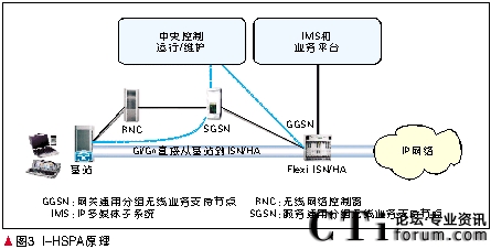 Mb/s為例,一個(gè)1 500個(gè)扇區(qū)的HSDPA網(wǎng)絡(luò)所產(chǎn)生的數(shù)據(jù)量為21.6 Gb/s。目前業(yè)界RNC的數(shù)據(jù)吞吐量僅達(dá)到1 Gb/s。今天各運(yùn)營商建設(shè)的3G網(wǎng)絡(luò)與2G共用核心網(wǎng),其帶寬和數(shù)據(jù)處理能力遠(yuǎn)遠(yuǎn)不能滿足HSPA高數(shù)據(jù)率的需求。當(dāng)數(shù)據(jù)負(fù)荷激增時(shí)運(yùn)營商將面對(duì)RNC/SGSN的擴(kuò)容的巨大壓力。此外在每一個(gè)節(jié)點(diǎn)處對(duì)數(shù)據(jù)包的重新拆裝會(huì)導(dǎo)致在每一節(jié)點(diǎn)都要引入額外的時(shí)延。結(jié)果會(huì)產(chǎn)生較長的網(wǎng)絡(luò)時(shí)延。對(duì)于移動(dòng)互聯(lián)網(wǎng)應(yīng)用,這種多層次的網(wǎng)絡(luò)結(jié)構(gòu)是沒有必要的。使網(wǎng)絡(luò)扁平化不僅可以簡化設(shè)備降低成本,還可以減少時(shí)延。I-HSPA應(yīng)運(yùn)而生。這種架構(gòu)把基站通過Gi/Gn口直接連接到GGSN節(jié)點(diǎn)(通向互聯(lián)網(wǎng)和數(shù)據(jù)業(yè)務(wù)的網(wǎng)關(guān))[5]。I-HSPA原理如圖3所示。