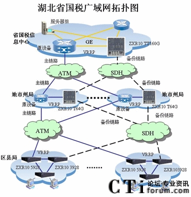 湖北省國(guó)稅三級(jí)專網(wǎng)已經(jīng)建成,但是存在單點(diǎn)單鏈路隱患,為了保證網(wǎng)絡(luò)可靠運(yùn)行,2006年湖北國(guó)稅攜手中興通訊對(duì)省國(guó)稅系統(tǒng)的網(wǎng)絡(luò)進(jìn)行備份網(wǎng)絡(luò)改造,結(jié)合稅務(wù)系統(tǒng)金稅三期網(wǎng)絡(luò)需求,網(wǎng)絡(luò)改造采用SDH線路來(lái)組建高帶寬的廣域網(wǎng)絡(luò),同時(shí)與原有的網(wǎng)絡(luò)設(shè)備(包括路由器、交換機(jī))及網(wǎng)絡(luò)接入設(shè)備實(shí)現(xiàn)互連互通,互為備份。