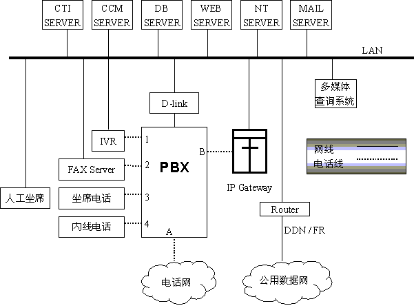 上圖所示的分布于不同地區(qū)的多個系統(tǒng)可以互相聯(lián)接,構成分布式客戶服務中心,如地市話務員回答不了客戶的問題,可轉接到省中心,話務員在坐席上操作請求CCM轉接省中心,CCM通過CTI SERVER控制PBX將A與B接通,IP網(wǎng)關響應呼叫,將電話號碼信號翻譯成相關的IP地址,將線路上的語音信號處理成數(shù)據(jù)信息并打包,通過本地LAN、本地ROTUER、公用數(shù)據(jù)網(wǎng)、省中心LAN等發(fā)送到省中心的IP網(wǎng)關、呼叫到達省中心PBX的B,按省中心系統(tǒng)的排隊和選擇坐席的規(guī)則選擇坐席,省中心的IP網(wǎng)關將接收到的數(shù)據(jù)解包還原成語音信號通過B送坐席電話3,雙方通話。這樣全省各市縣將聯(lián)結成一個大的分布式呼叫中心,同時IP電話也可用于企業(yè)內部通信,通信費將降至原來的一半以下。
