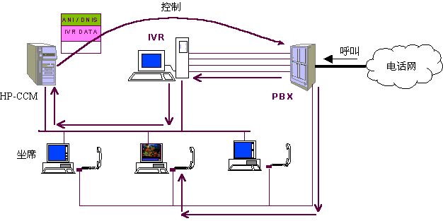 在任何一個步驟中,如客戶選擇了人工坐席,則IVR請求CCM根據(jù)多種情況選擇一個空閑坐席(選擇方法見下文)并控制PBX將呼叫與選擇的人工坐席接通,同時系統(tǒng)在客戶對IVR操作的過程中,已經(jīng)幀測到了客戶所使用的電話號碼、客戶的按鍵信息,系統(tǒng)還記錄有客戶上次的呼叫情況等數(shù)據(jù),這些數(shù)據(jù)基本上可以確定客戶大體關心的問題,對于老客戶甚至可以初步認定呼叫者的身份、年齡、性別、業(yè)務辦理情況等,因此,話務員在與客戶談話之前就已經(jīng)了解了相當多的信息,并控制選定的坐席屏幕顯示有關客戶信息,便于直接進入正題,提高了效率?蛻襞c坐席的交流過程中,坐席可通過終端請求CCM控制PBX將本次呼叫與其他話務員(坐席)、專家或業(yè)務辦公室(如內線電話)等接通,當坐席人員將呼叫轉移到另一坐席或專家時,系統(tǒng)將在本呼叫中收集的各類數(shù)據(jù)同時轉向下一坐席電腦。在坐席人員解答客戶問題時,可將問題及解答情況收集,便于分析坐席人員的業(yè)務素質和問題傾向,從而有針對性地培訓坐席人員。對于客戶來講,他可以通過電話按鍵在話務員、自動語音、傳真、專家和業(yè)務辦公室之間漫游,系統(tǒng)將記錄客戶漫游的路徑,對于設計較好的菜單和路經(jīng)來說,客戶的漫游路徑基本上可以反映出其需求,大量客戶的漫游路徑無疑將反映出市場需求。