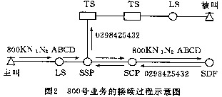 --用戶在撥打800號業(yè)務(wù)用戶號碼時,首先由網(wǎng)絡(luò)點上的普通電話交換機接收,并把800KN1N2ABCD號碼經(jīng)話路傳送給業(yè)務(wù)交換點SSP,再由SSP將此號碼經(jīng)No.7信令鏈路送到業(yè)務(wù)控制點SCP,SCP通過在業(yè)務(wù)數(shù)據(jù)庫SDP中查尋譯碼表將此號碼翻譯成普通的電話號碼回送SSP,最后由SSP負責(zé)完成電路的連接,該過程如圖2所示。