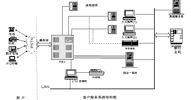 由中國(guó)光大電腦開發(fā)有限公司提供的,中小規(guī)模銀行客戶服務(wù)中心系統(tǒng)解決方案,特別適合地市級(jí)銀行的需要。該系統(tǒng)已成功地應(yīng)用于工行石家莊分行,向工行客戶提供16線對(duì)公、儲(chǔ)蓄、信用卡電話銀行自動(dòng)應(yīng)答和6線人工咨詢兩類服務(wù)。其中電話銀行自動(dòng)應(yīng)答包括16路語音自動(dòng)應(yīng)答、12路傳真、8路圖文電話和計(jì)算機(jī)遠(yuǎn)程服務(wù)。