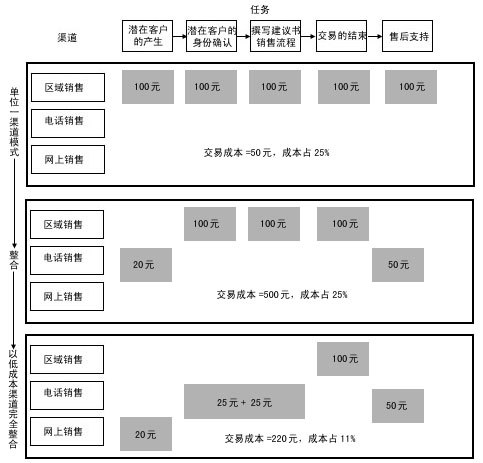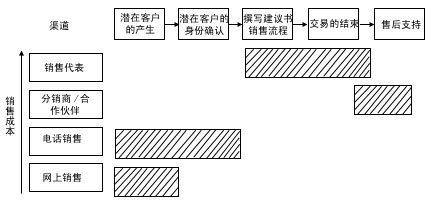 渠道整合強調(diào)在一個銷售過程中分工的不同給企業(yè)帶來更多的利潤,將銷售過程的任務一一分配給不同成本的渠道來完成。銷售過程的中間環(huán)節(jié)——面對面的銷售和交易的達成,通常需要由成本較高的區(qū)域銷售代表和分銷伙伴來完成,客戶的產(chǎn)生及身份的確認和售后服務環(huán)節(jié)通常由低成本渠道完成。現(xiàn)在,我們對照圖4來比較一下: