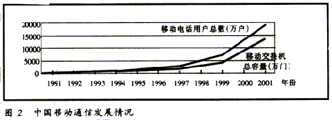 預計2001年中國移動通信用戶將新增4400萬戶以上,用戶總數將達到1.3億戶,移動交換機新增5000萬門,容量總數將達到1.8億門,市場總額為1000億元左右。另外,在2001年下半年,第三代移動通信網將投入建設和試驗,國際上3大系統(tǒng)(TD-SCDMA、W-CDMA、CDMA2000)將在中國進行試驗。中國移動數據網絡和業(yè)務將逐步展開,移動業(yè)務種類逐步增加。