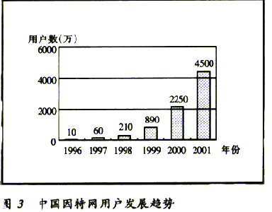 據CNNIC統(tǒng)計的數據表明,到2000年12月31日止,中國的因特網用戶達到2250萬戶,上網計算機892萬臺,預計2001年中國將有超過4500萬的網民。中國域名總數為12.2萬個,WWW站點數26.54萬個。中國因特網的發(fā)展速度驚人,與國際因特網的發(fā)展速度相當。中國因特網用戶發(fā)展趨勢見圖3。