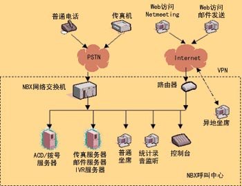NBX網(wǎng)絡(luò)呼叫中心的核心是3Com公司的NBX網(wǎng)絡(luò)電話交換機(jī),它具有PBX的功能,支持多種外線接入方式,呼入的語音信號(hào)轉(zhuǎn)換為數(shù)據(jù)包,在局域網(wǎng)內(nèi)部傳輸,實(shí)現(xiàn)局域網(wǎng)內(nèi)部語音、數(shù)據(jù)的統(tǒng)一。坐席可以延伸到數(shù)據(jù)網(wǎng)可以達(dá)到的地方(適當(dāng)?shù)膸挘,而不受地理位置的限制。你可以通過申請各類專線,如VPN、DDN等,將計(jì)算機(jī)連入呼叫中心,實(shí)現(xiàn)分地域、分種類、分?jǐn)?shù)據(jù)的服務(wù)。NBX網(wǎng)絡(luò)呼叫中心擴(kuò)大了對外服務(wù)方式,通過上網(wǎng)訪問企業(yè)主頁,并使用Windows集成的Netmeeting軟件通過使用電腦的聲卡、耳機(jī)、麥克風(fēng)直接與服務(wù)代理人員進(jìn)行語音交流。