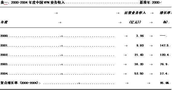2000年,中國VPN運(yùn)營業(yè)務(wù)收入為人民幣3.96億元,主要業(yè)務(wù)提供商為新興的電信運(yùn)營商如網(wǎng)通、吉通、聯(lián)通等公司,以及數(shù)量可觀的或明或暗的網(wǎng)絡(luò)公司,VPN用戶主要集中在規(guī)模較大的外企、金融領(lǐng)域以及與IT相關(guān)的企業(yè)之中。隨著更多的虛擬運(yùn)營商進(jìn)入VPN服務(wù)市場,以及企業(yè)成本意識的不斷增強(qiáng),VPN用戶群體已經(jīng)呈擴(kuò)散之勢,制造業(yè)、FMCG連鎖經(jīng)營業(yè)、酒店業(yè)等已經(jīng)迅速進(jìn)入這一市場。預(yù)計到2004年度,國內(nèi)VPN業(yè)務(wù)收入可以達(dá)到52.5億元人民幣,年復(fù)合增長率為95.6%。各年度測算數(shù)據(jù)見表一。