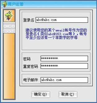 DICO下載后的安裝過程比較簡單: "接收協(xié)議"后一路"下一步"就OK了。然后是注冊,過程也委簡單:運行后,第一次使用時點"注冊"(以后使用時只要輸入用戶名或密碼登錄就是了),隨后的"用戶注冊"窗口中填寫好相關的選項后點"確定"(下圖2)就OK了!