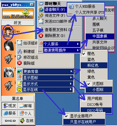用申請時的用戶名及密碼登錄后(咦~~你會發(fā)現(xiàn)其主界面與QQ差不多哦),你可對自己的DICO進行常規(guī)性設置(下圖3)。