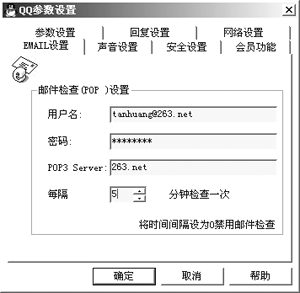 IM和E-mail是我們在網上最常用的兩種工具,如今不少IM軟件將兩者作了完美的結合。在QQ中你可以直接給自己的好友發(fā)郵件,而無須再輸入E-mail地址;此外對于自己的信箱QQ還有檢查新郵件功能,在“系統(tǒng)參數”中設置您自己的E-mail,填好POP3地址,您可以選擇定時檢查時間,QQ就會自動檢查有否新郵件到達。對于MSN