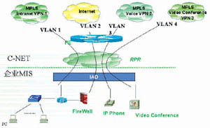 VPN中,實現(xiàn)業(yè)務(wù)在VLAN 和VPN中的無縫對接,以保證用戶數(shù)據(jù)的安全、高效傳輸;接入網(wǎng)采用基于RPR或SDH的MSPP環(huán)實現(xiàn)IP業(yè)務(wù)和TDM業(yè)務(wù)的綜合傳輸;在商業(yè)樓宇內(nèi)主要采用IAD設(shè)備將客戶的數(shù)據(jù)、語音、專線等業(yè)務(wù)接入CNC