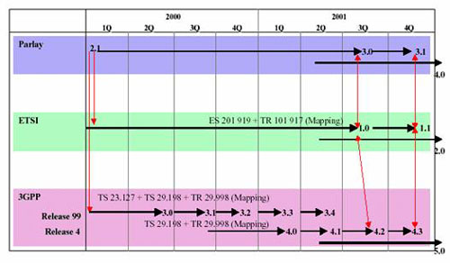 API規(guī)范。這些組織主要包括ITU-T、ETSI、IEEE、IETF、3GPP、OMG、TINA-C、Softswitch論壇、JAIN等。目前,Parlay工作組、ETSI和3GPP已經(jīng)聯(lián)合起來,共同發(fā)展Parlay協(xié)議。圖2為3個(gè)標(biāo)準(zhǔn)組織發(fā)布的Parlay版本的對應(yīng)關(guān)系。