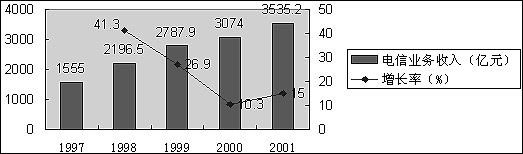 過去幾年是我國(guó)電信業(yè)大發(fā)展時(shí)期,電信收入平均每年增長(zhǎng)約23%。電話用戶總數(shù)與移動(dòng)電話總數(shù)迅速增長(zhǎng),并在2001年超過美國(guó),躍居世界第一。但是,過去的高增長(zhǎng)并不必然帶來明天的高增長(zhǎng),在2000年和2001年,我國(guó)電信收入已經(jīng)呈現(xiàn)出稍高于GDP的中速增長(zhǎng)態(tài)勢(shì)。
