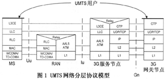 對(duì)圖1的簡(jiǎn)要描述如下:移動(dòng)用戶(MS)到RAN左側(cè)部分是無(wú)線接入網(wǎng)絡(luò)的無(wú)線用戶接口(Uu),實(shí)現(xiàn)了用戶業(yè)務(wù)通過(guò)空中無(wú)線鏈路接入3G網(wǎng)絡(luò)的功能,主要包含物理層(采用WCDMA和TD-CDMA技術(shù))、媒體接入層(MAC)、無(wú)線鏈路層(RLC);在RAN內(nèi)部通過(guò)協(xié)議中繼(Relay)實(shí)現(xiàn)無(wú)線鏈路和有線鏈路的對(duì)接;在RAN和3G服務(wù)節(jié)點(diǎn)之間的接口(Iu)是以ATM技術(shù)為支撐的有線接入段協(xié)議,為支持Internet業(yè)務(wù),采用AAL5適配層協(xié)議,物理層(L1)無(wú)明確限定具體傳輸方式;在此之上,透過(guò)RAN、MS和3G服務(wù)節(jié)點(diǎn)之間存在兩個(gè)高層連接,即邏輯聯(lián)絡(luò)層(LLC)和更為復(fù)雜的第三層實(shí)體(L3CE),L3CE是一些以Client/Server方式構(gòu)件的軟件實(shí)體,實(shí)現(xiàn)諸如無(wú)線資源管理、呼叫控制、移動(dòng)管理等網(wǎng)絡(luò)級(jí)功能;在3G服務(wù)節(jié)點(diǎn)內(nèi)部,為實(shí)現(xiàn)到Internet網(wǎng)絡(luò)的接入,再作一次協(xié)議中繼,這里,第三層實(shí)體的信息映射到通用分組無(wú)線服務(wù)的隧道協(xié)議GTP(GPRS Tunneling Protocol);3G服務(wù)訪問(wèn)點(diǎn)到3G網(wǎng)關(guān)之間的Gn接口存在清晰的、以TCP/IP協(xié)議為主體的五層對(duì)應(yīng)關(guān)系;構(gòu)建在最上層的是移動(dòng)用戶到3G網(wǎng)關(guān)的UMTS用戶進(jìn)程,它通過(guò)3G網(wǎng)關(guān)進(jìn)入Internet骨干網(wǎng),最終實(shí)現(xiàn)用戶對(duì)Internet的訪問(wèn)。