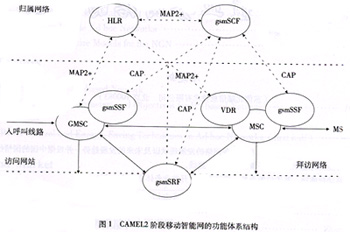 在移動(dòng)通信領(lǐng)域,歐洲電信標(biāo)準(zhǔn)學(xué)會(huì)(ETSI)制定的CAMEL系列標(biāo)準(zhǔn)為基于GSM移動(dòng)通信網(wǎng)絡(luò)的移動(dòng)智能網(wǎng)提供了統(tǒng)一的規(guī)范。其中CAMEL2階段的標(biāo)準(zhǔn)符合ITU-T的IN CS-1,支持各種基于語(yǔ)音的智能業(yè)務(wù)。CAMEL2階段移動(dòng)智能網(wǎng)的功能體系結(jié)構(gòu)如圖1所示。CAMEL3階段的標(biāo)準(zhǔn)基于CS-2,主要增加了對(duì)GPRS移動(dòng)數(shù)據(jù)業(yè)務(wù)以及短消息業(yè)務(wù)的支持。