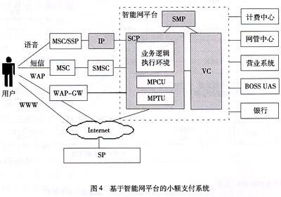 鑒于以上原因,目前中國(guó)移動(dòng)正在建設(shè)的全國(guó)范圍的小額支付系統(tǒng)已確定采用基于智能網(wǎng)平臺(tái)的建設(shè)方式;谥悄芫W(wǎng)平臺(tái)的小額支付系統(tǒng)如圖4所示。