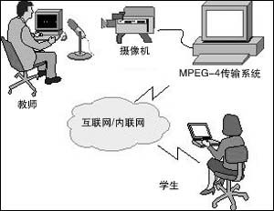 對于需要上課的學生,可以利用MPEG-4交互教學系統(tǒng),在自己的家里觀看教師講課,不但能看到教師,還可以同步看到教師計算機屏幕上的講義。如果在學生家里的計算機上安裝了麥克風和攝像頭,還可以進行視頻交流,“面對面的”溝通。學生可以“舉手”回答老師的問題,學生之間可以討論,老師可以進行網(wǎng)上測驗。