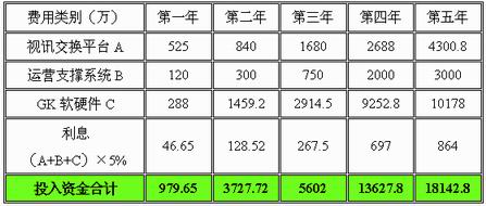 綜合上面三部分成本構(gòu)成,得出從系統(tǒng)建設(shè)并開始運(yùn)營的頭五年中,各個(gè)年份建網(wǎng)資金投入和總投入: