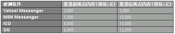 在使用Windows平臺下的PC也只有內(nèi)存還稍顯珍貴,所以就這四款軟件所占用的內(nèi)存進行了對比。結(jié)果如下:Yahoo! Messenger所占的內(nèi)存,無論在登錄前后都是最小的;第二名,MSN Messenger在功能龐大的情況下,能做得如此精巧實屬難得;第三名,ICQ從2000版開始對內(nèi)存的占用始終比較穩(wěn)定,只是在出了中文界面后稍高一些;第四名,QQ啟動出現(xiàn)登錄界面時還沒顯出味口有多大,不想登錄后隨著系統(tǒng)信息和Flash廣告等傳到客戶端占用內(nèi)存的峰值竟然能達到15,000K,相信內(nèi)存小一些的機器在QQ登錄后就要多等一會兒了。