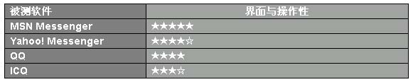 對于IM類軟件來說,網(wǎng)友希望其界面在精美的同時越簡單越直接越好。在這一點上,MSN Messenger最為突出,界面精致,操作極易上手,在本次評測中獲得一致認可,位列第一;Yahoo! Messenger操作上也比較直觀,只是“做工”顯得有些粗糙;被測的QQ2003剛剛在界面上做了重大的改變,只是稍顯零亂,對MSN的部分借鑒比較成功,對于一個新用戶來說最基本的功能的使用還算方便;ICQ功能的確強大,界面有些老舊,(ICQ Lite可以改變這一切,但是ICQ Lite僅僅是ICQ的一個插件版本,本次評測沒有考慮),ICQ操作對中文用戶來說也過于繁復(fù)。