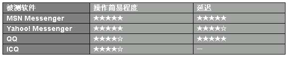 MSN Messenger和Yahoo! Messenger的操作都很簡單,只是MSN Messenger在同樣的畫質(zhì)下延遲要小于Yahoo! Messenger,表現(xiàn)出更優(yōu)的實用性。QQ操作也不算太復(fù)雜,只是會員和非會員在功能上有一些限制,不過在同畫質(zhì)的延遲方面做的算是出色,ICQ操作沒有測試成功。