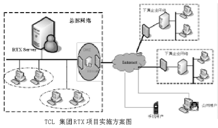 在RTX項目的實施上,TCL集團公司專門購置了一臺P4 2.4G,256M,40G的高配置服務器作為RTX Server(如圖),安裝在集團公司的總部網(wǎng)絡上,同時連接到集團公司的專線上,并分配外部IP地址,供異地員工登陸到服務器。整個RTX實施方案如圖1所示:在硬件方面,只添加一臺RTX Server作為IM服務器,無需對現(xiàn)有網(wǎng)絡作大規(guī)模改動;在軟件方面,在RTX Server上安裝最新的服務器端軟件RTX 3.2版本,使用RTX的集團員工自行下載安裝RTX客戶端,客戶端能傻瓜式在線更新。