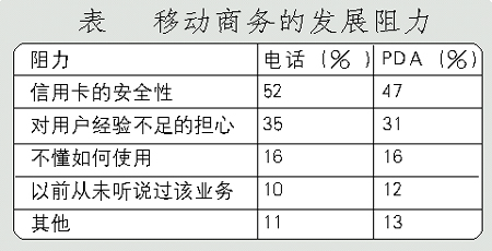 手機(jī)支付業(yè)務(wù)的進(jìn)一步發(fā)展主要受制于用戶對(duì)該項(xiàng)業(yè)務(wù)的接受程度。Forrester研究公司的研究表明,超過一半的被訪者認(rèn)為信用卡的安全性是移動(dòng)商務(wù)發(fā)展的主要阻力。(調(diào)查結(jié)果見下表)