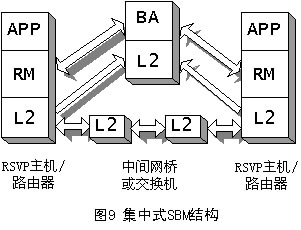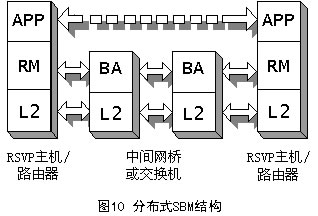SBM有兩種形式的體系結(jié)構(gòu):集中式結(jié)構(gòu)和分布式結(jié)構(gòu),它取決于BA所處的位置,如圖9和圖10所示。不管在哪種形式的結(jié)構(gòu)中,RM都必須在需要請(qǐng)求資源的端系統(tǒng)中。APP表示需要使用RM的應(yīng)用,它可以是用戶(hù)應(yīng)用程序,也可以是高層協(xié)議(如RSVP)。