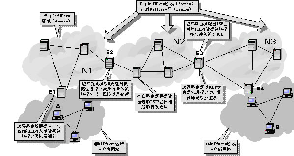 DiffServ區(qū)(region)則是由連續(xù)的DS區(qū)域構(gòu)成。一個(gè)DS區(qū)內(nèi)的DS區(qū)域可以支持不同的PHB組,并且各自區(qū)域的DSCP到PHB的映射函數(shù)也可能不相同。在不同的DS區(qū)域之間,必須對(duì)SLA和TCA進(jìn)行調(diào)節(jié),以協(xié)調(diào)彼此之間的服務(wù)語(yǔ)義。這樣,通過(guò)在上游DS區(qū)域和下游DS區(qū)域之間建立SLA或TCA,區(qū)分服務(wù)可以擴(kuò)展到多個(gè)DS區(qū)域。