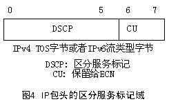 DS標(biāo)記域定義為IPv4頭部的TOS(Type of Service)字節(jié)或IPv6頭部的流類(lèi)型(Traffic Class)字節(jié)。如圖4所示。其中DSCP(6bit)即為區(qū)分服務(wù)標(biāo)記,CU(2bit)在本體系中沒(méi)有使用,IETF已將它定義為ECN(Explicit