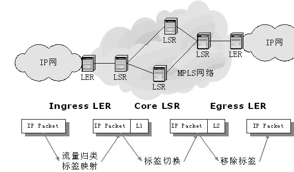 標(biāo)簽邊緣路由器(Lable Edge Router,LER):LER是MPLS網(wǎng)絡(luò)同其他網(wǎng)絡(luò)相連的邊緣設(shè)備,它提供流量分類(lèi)和標(biāo)簽的映射(作為Ingress)、標(biāo)簽的移除功能。