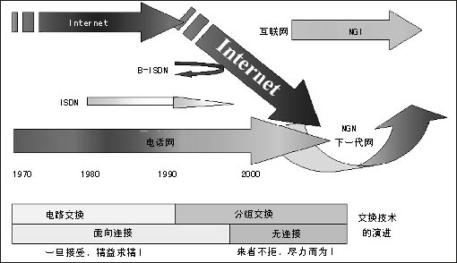 傳統(tǒng)電信網(wǎng)和互聯(lián)網(wǎng)都面臨著挑戰(zhàn),基于電話業(yè)務(wù)設(shè)計的電路交換網(wǎng)不能靈活適應(yīng)帶寬各異的數(shù)據(jù)業(yè)務(wù)的發(fā)展。專為數(shù)據(jù)業(yè)務(wù)設(shè)計的互聯(lián)網(wǎng)則存在著安全性、可管理性、商業(yè)模式等問題的困擾。NGI對目前電信網(wǎng)的主要盈利業(yè)務(wù)語音的質(zhì)量保證以及對電信網(wǎng)增長空間很大的業(yè)務(wù)(移動)關(guān)注不夠。NGI可能達到的目標不能滿足電信界的需要。因此,在NGI之后ITU和ETSI等提出了更高的目標——NGN,這就是NGN的提出背景。信息產(chǎn)業(yè)部電信研究院科技委副主任委員雷震洲認為,兩大亮點點燃了NGN:一是數(shù)據(jù)超過語音的信息需求,全球互聯(lián)網(wǎng)用戶目前已逾7億,全世界在網(wǎng)上傳送的以IP為代表的數(shù)據(jù)業(yè)務(wù)量已經(jīng)超過語音業(yè)務(wù)量;二是移動超過固定的個性化需求,全球移動用戶已經(jīng)超過13億,近100個國家的移動用戶數(shù)已經(jīng)超過固定用戶數(shù),我國在2003年10月移動用戶也超過了固定用戶數(shù)。