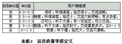 對(duì)于IP電話質(zhì)量的評(píng)價(jià)采用MOS(主觀平均評(píng)分)值評(píng)價(jià),評(píng)測(cè)方法在ITU-TP.800中定義。實(shí)際中可以采用PESQ(語音質(zhì)量的知覺評(píng)估)客觀測(cè)試方法,在ITU-TP.862(PESQ)中定義。MOS值的定義如下表所示: