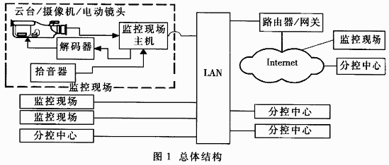 遠程監(jiān)控系統(tǒng)一般包括三部分:前端監(jiān)控現(xiàn)場、通信設備和后端分控中心。整個系統(tǒng)基于Client/Server(客戶機/服務器)模式。總體結構如圖1所示。