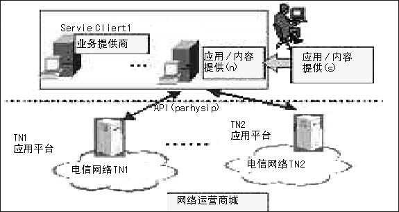 這種模式是指應(yīng)用服務(wù)器的兩部分應(yīng)用平臺(tái)和業(yè)務(wù)提供分別由傳統(tǒng)電信運(yùn)營(yíng)商和AP控制。應(yīng)用平臺(tái)在運(yùn)營(yíng)商域內(nèi)由運(yùn)營(yíng)商進(jìn)行控制,而AP或者CP(Content provider)可以與傳統(tǒng)電信運(yùn)營(yíng)商簽約來(lái)提供業(yè)務(wù),業(yè)務(wù)與應(yīng)用提供通過(guò)開放的API由第三方提供。