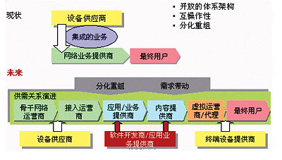 軟交換將導(dǎo)致業(yè)務(wù)為主的商業(yè)模式。早期ICP是以內(nèi)容為主的商業(yè)模式,包括YAHOO在內(nèi)的內(nèi)容提供商們都已經(jīng)在“.COM”的泡沫中體會(huì)到這種商業(yè)模式是難以成功的。而DoCoMo和i-mode的成功給我們帶來了新的可贏利的以接入為主的商業(yè)模式,但我們知道,i-mode的成功是與日本整個(gè)社會(huì)環(huán)境分不開的,并不是可以照搬拷貝的。真正能夠幫助電信運(yùn)營商成功的模式是以業(yè)務(wù)為主的商業(yè)模式。用戶關(guān)心的是運(yùn)營商能為自己提供多少有價(jià)值的業(yè)務(wù),誰能夠提供更多更好的業(yè)務(wù),誰就能吸引更多的用戶,誰就能在市場(chǎng)上取得成功。隨著電信市場(chǎng)的競(jìng)爭(zhēng)加劇,運(yùn)營商在接入上的壟斷會(huì)逐漸打破,以接入為主的商業(yè)模式也會(huì)逐漸失去它的競(jìng)爭(zhēng)優(yōu)勢(shì)。在這種競(jìng)爭(zhēng)的電信市場(chǎng)環(huán)境下,只有不斷提供新的業(yè)務(wù),提高服務(wù)質(zhì)量,滿足用戶不斷增長的通信需求,才能在市場(chǎng)上立于不敗之地。