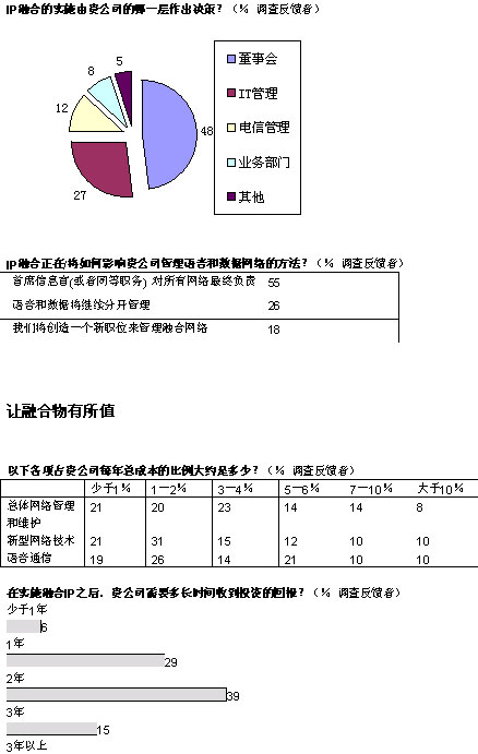 盡管如此,雖然IP融合的真正長期效益可能有利于提高員工效率,但是投資必須得到公司首席財務官的認可。在總體網(wǎng)絡成本中預計可以節(jié)約多少?大多數(shù)公司希望削減10%-20%的費用,也有相當一部分公司期望減少30%-40%的費用。上述報告中提到的實例中表明,這樣的節(jié)約是可以實現(xiàn)的。