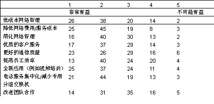 您認為融合網(wǎng)絡將怎樣使您的企業(yè)受益(現(xiàn)在或者將來)?請為每一項打1至5分,1表示非常有益,5表示不可能有益。(% 調(diào)查反饋者)