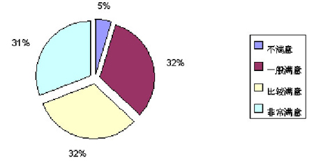 對(duì)于短信業(yè)務(wù)的使用情況,僅有31%的用戶認(rèn)為非常滿意,認(rèn)為比較滿意的用戶比較多,其比例占樣本總量的32%。認(rèn)為一般滿意和不滿意的用戶比例分別是32%和5%(見(jiàn)圖3)。