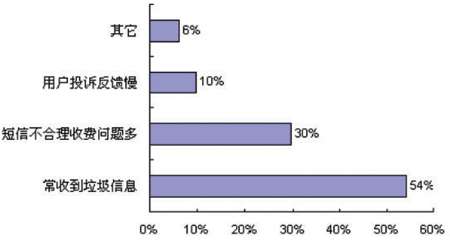 調(diào)研結(jié)果顯示,用戶對(duì)目前經(jīng)常收到垃圾信息表示不滿比例高達(dá)54%;其次是短信費(fèi)用問(wèn)題,用戶的不滿意見(jiàn)也比較多,例如短信的訂閱與退訂,對(duì)于一些短信費(fèi)用的不合理收取、一些訂閱業(yè)務(wù)無(wú)法取消等等,該比例為30%;另外有10%左右的用戶對(duì)解決投訴的及時(shí)性和有效性表示了不滿。