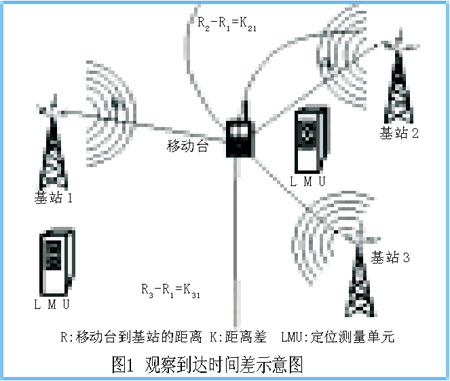 觀察到達時間差(OTDOA)是通過測量電波從發(fā)射機傳播到多個接收機的傳播時間差來確定目標(biāo)移動臺的位置。初步測量通過UE接收的下行鏈路公共導(dǎo)頻信道的到達時間差實現(xiàn)。3個基站形成的平面上,一點到兩個固定點的距離差如為定值時,該點必定在一條雙曲線上,兩條這樣的雙曲線的交點便可得到移動臺的位置,如圖1