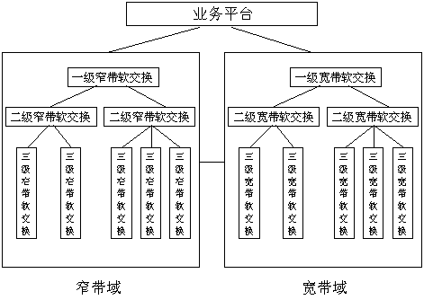 在控制層,軟交換的組網(wǎng)可以有兩種方式,即寬窄帶域分開組網(wǎng)方式(見圖3)和寬窄帶混合組網(wǎng)方式(見圖4)。