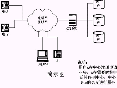 該業(yè)務方法涉及一種用戶電話轉(zhuǎn)移到CTI(Computer Telephony Integration)語音服務系統(tǒng)的接續(xù)服務方法,其CTI系統(tǒng)通過接口連接于公用電話網(wǎng),用戶在CTI系統(tǒng)登記,選擇服務功能,相關信息存入數(shù)據(jù)庫,用戶電話設置轉(zhuǎn)移;當客戶呼叫已轉(zhuǎn)移用戶電話時,自動接入CTI語音系統(tǒng),請求相關信息,對信息進行分析判斷、處理,查詢數(shù)據(jù)庫用戶信息,以用戶名義進行接續(xù)服務。其完全避免了傳統(tǒng)CTI系統(tǒng)的專用特服號碼服務的弊端,充分利用了交換機的功能,以用戶的電話號碼為客戶提供語音、傳真、數(shù)據(jù)及人工接續(xù)服務。