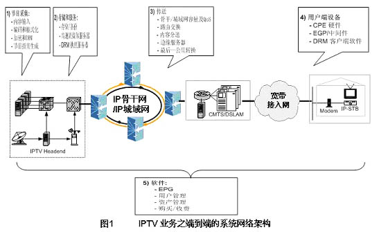 IPTV系統(tǒng)技術(shù)能用來提供將視音頻流媒體節(jié)目,如IP電視節(jié)目,從節(jié)目中心(first mile)播出,并通過骨干網(wǎng)、城域網(wǎng)和寬帶接入網(wǎng)(last mile)傳輸,直到被用戶接收之端到端的完整技術(shù)解決方案。一個端到端的IPTV系統(tǒng)一般具有節(jié)目采集、存儲和服務(wù)、節(jié)目傳送、用戶終端設(shè)備和相關(guān)軟件等五個功能部件。
