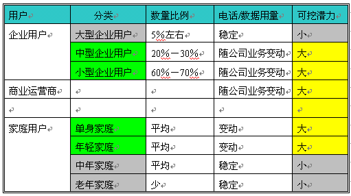 從以上表格可以清楚的顯示中小企業(yè)、商業(yè)運營商、年青用戶對電話和數(shù)據(jù)的使用不穩(wěn)定,這就意味者可發(fā)展、擴大使用的可能性非常大,是企業(yè)增加收入的潛在用戶,但最主要的是如何提高這些用戶的使用呢?經濟規(guī)律告訴我們如果你提供的商品對用戶有用,同時價廉、物美,用戶是不會拒絕的。對于電話運營商來講就是提供給企業(yè)帶來方便、效率、節(jié)省成本、方便管理的服務的同時,提高有效接通率。